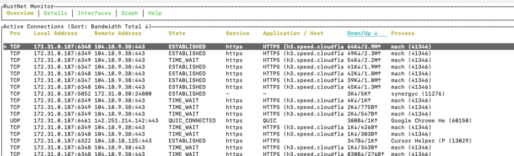 In the screenshot above you can see RustNet in action during a cloudflare speed test using mach. Every connection to cloudflare’s infrastructure gets attributed to the correct process, and the per-stream breakdown shows how the speedtest is handling its HTTP/3 streams.